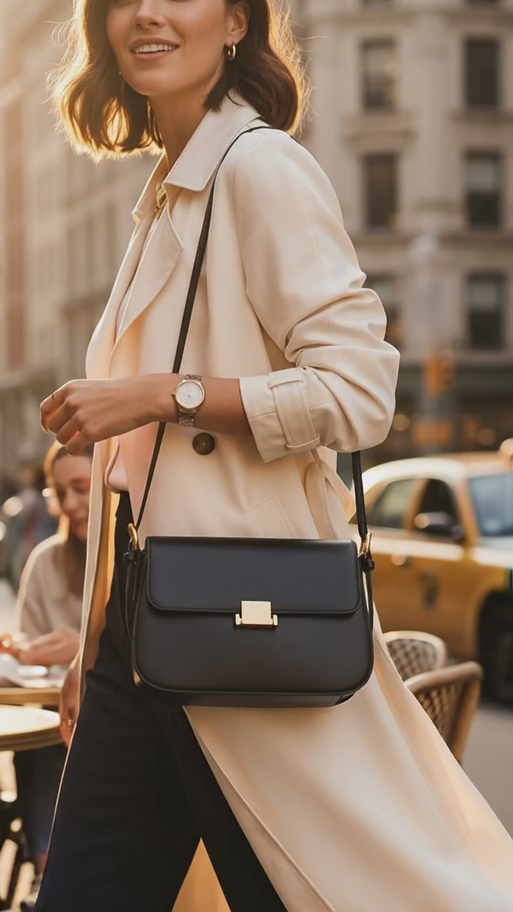 La fermeture à boucle métallique et la bandoulière unique confèrent au sac une allure raffinée et contemporaine. Une pièce intemporelle, idéale pour la ville ou les voyages légers.