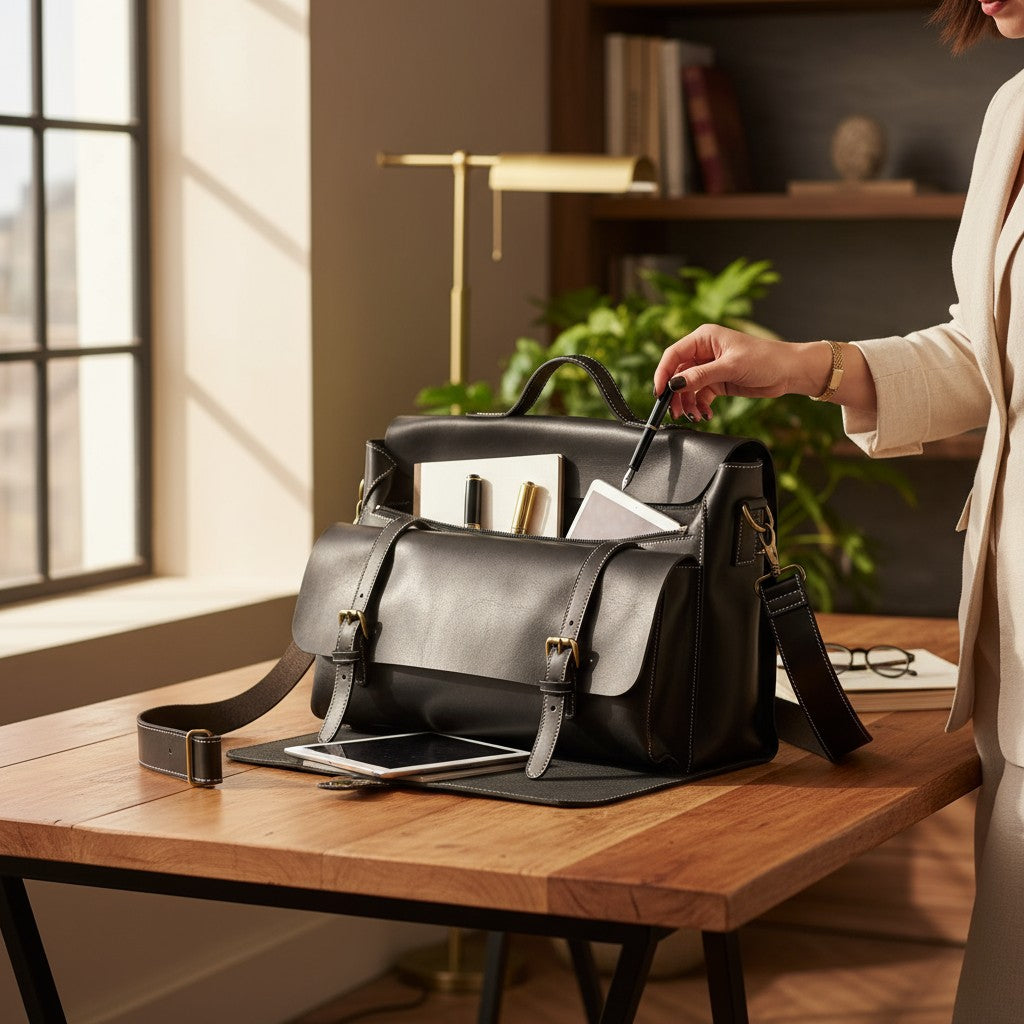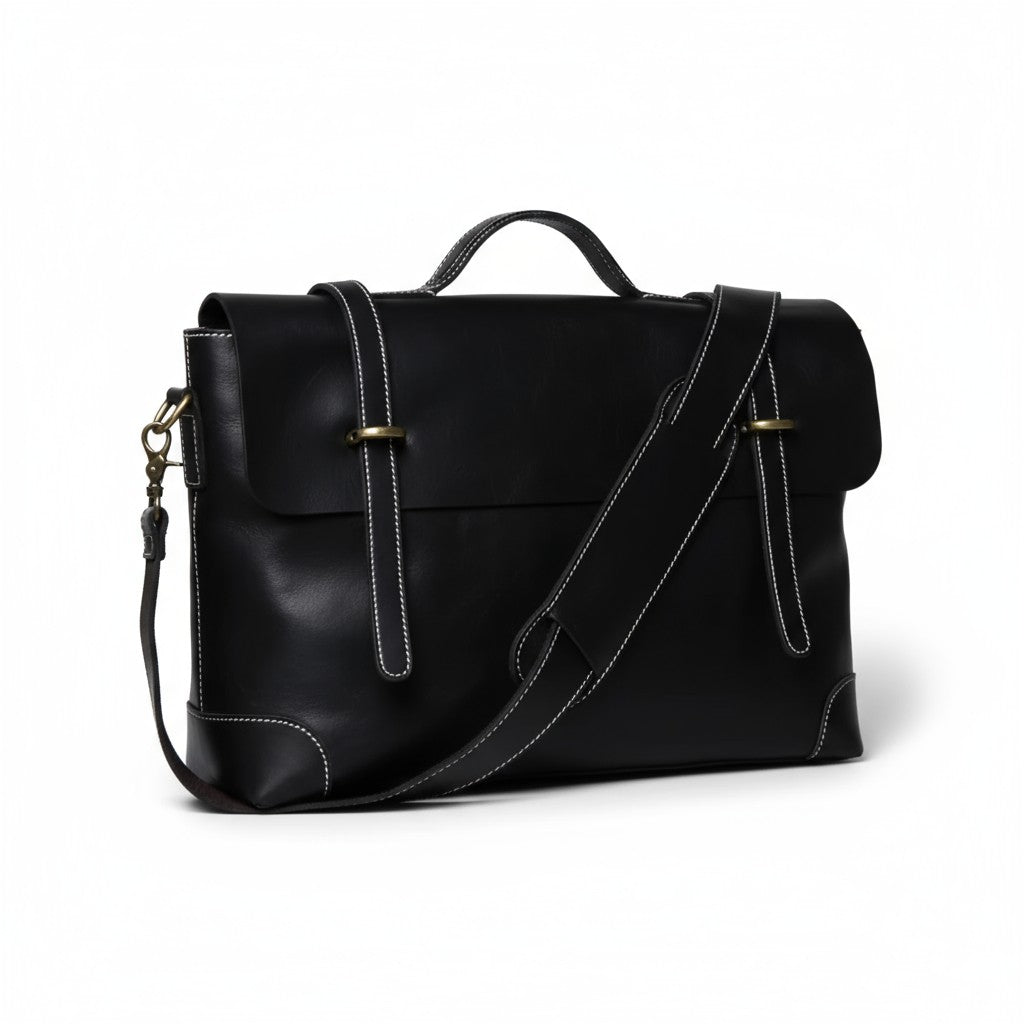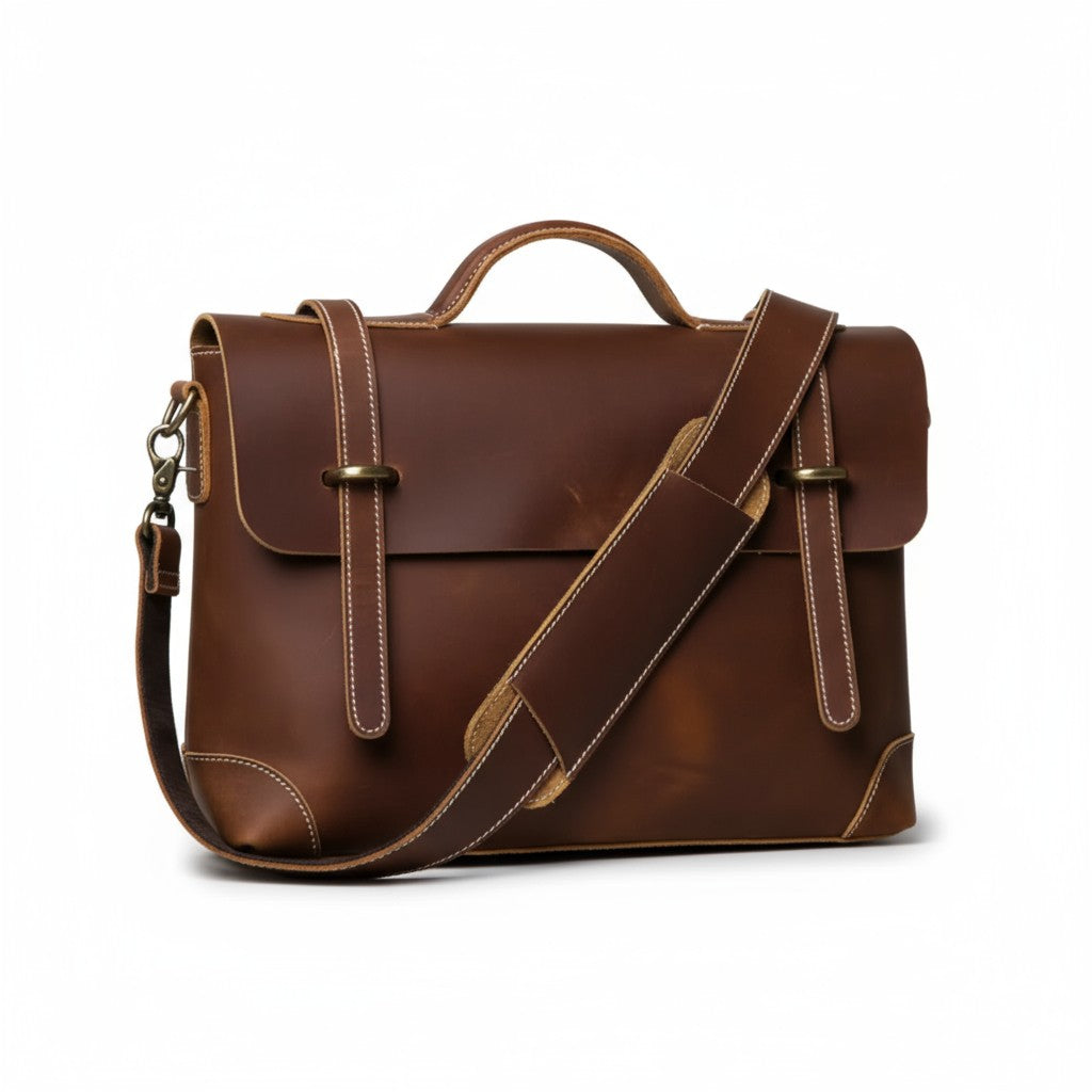 Réalisée en cuir de vache pleine fleur, elle offre une structure solide, une poignée rigide et une bandoulière ajustable pour un port confortable.